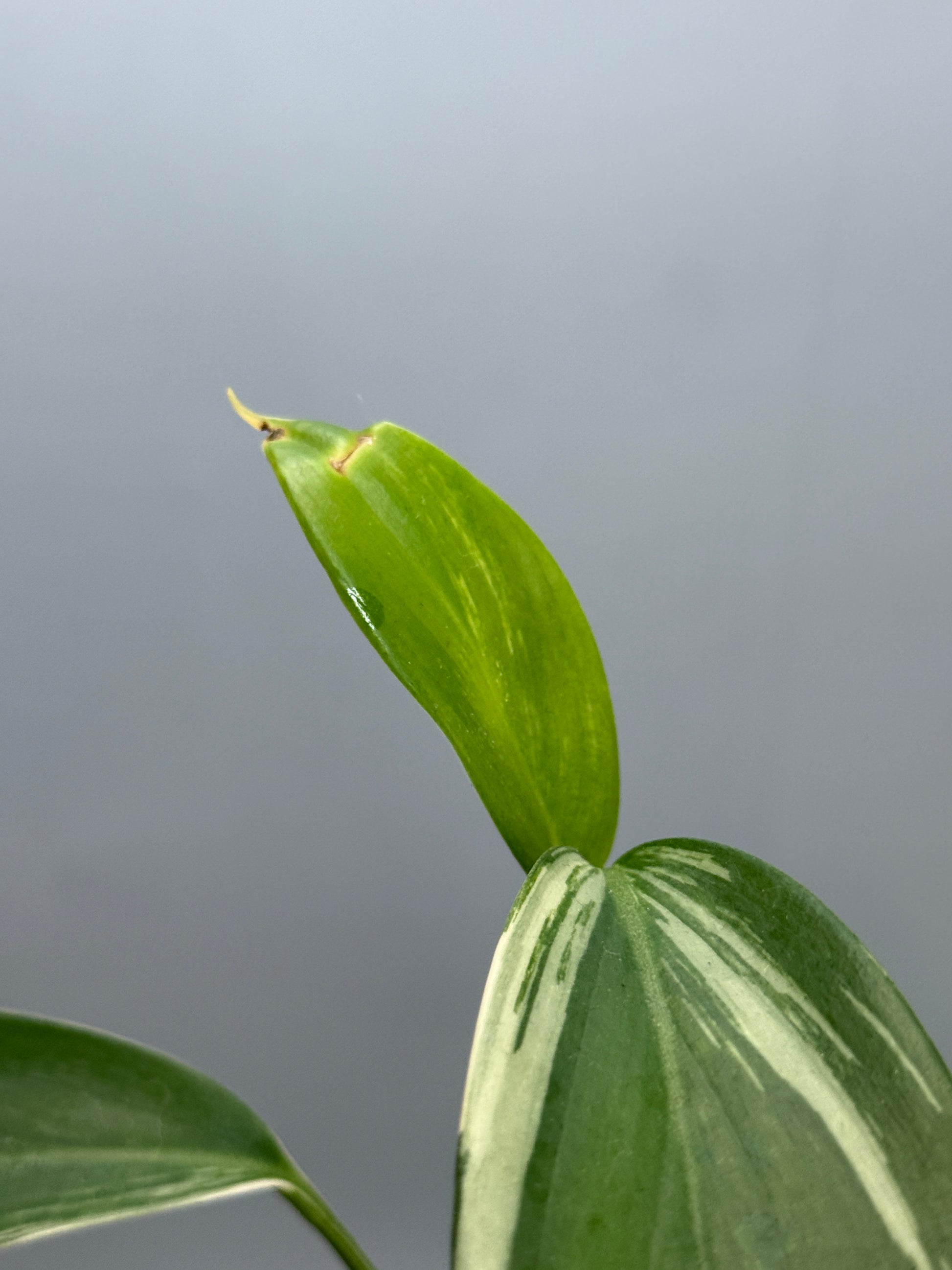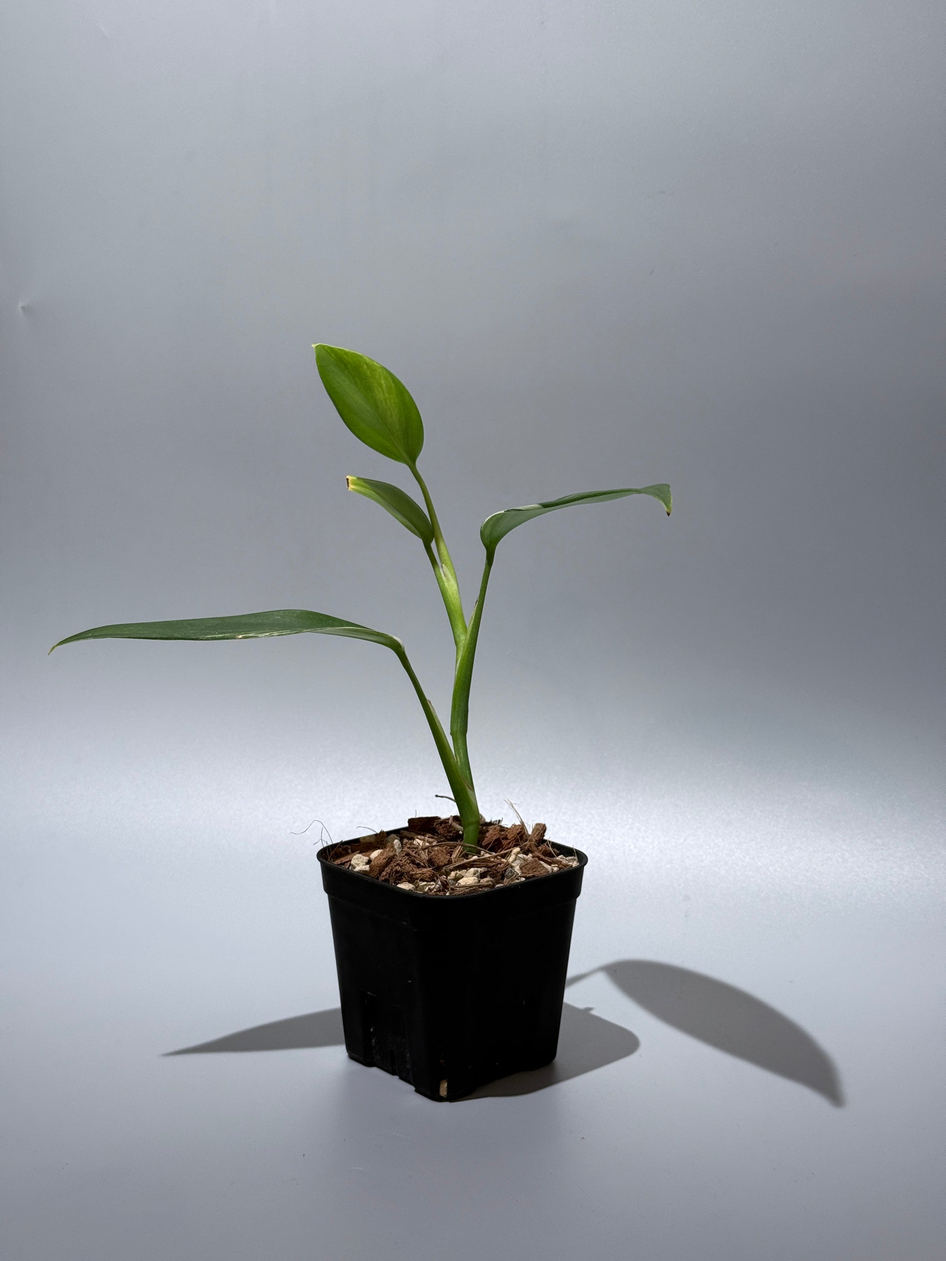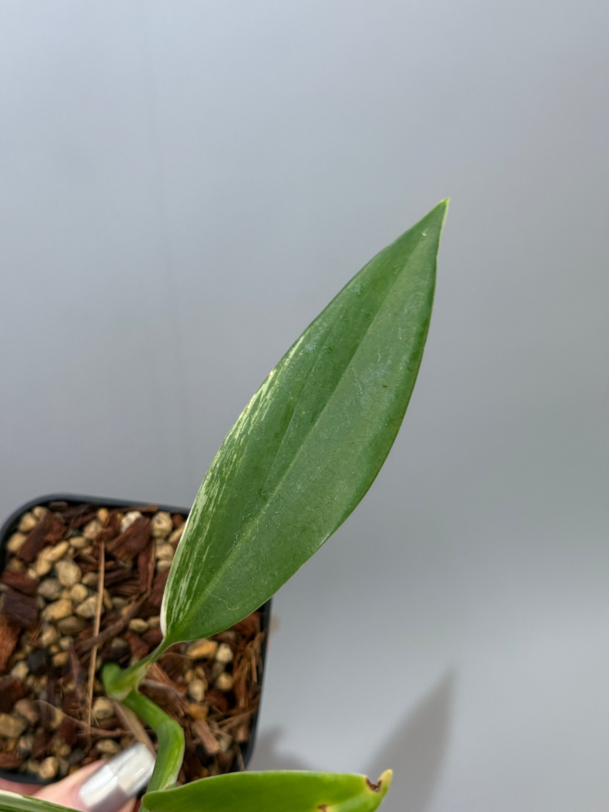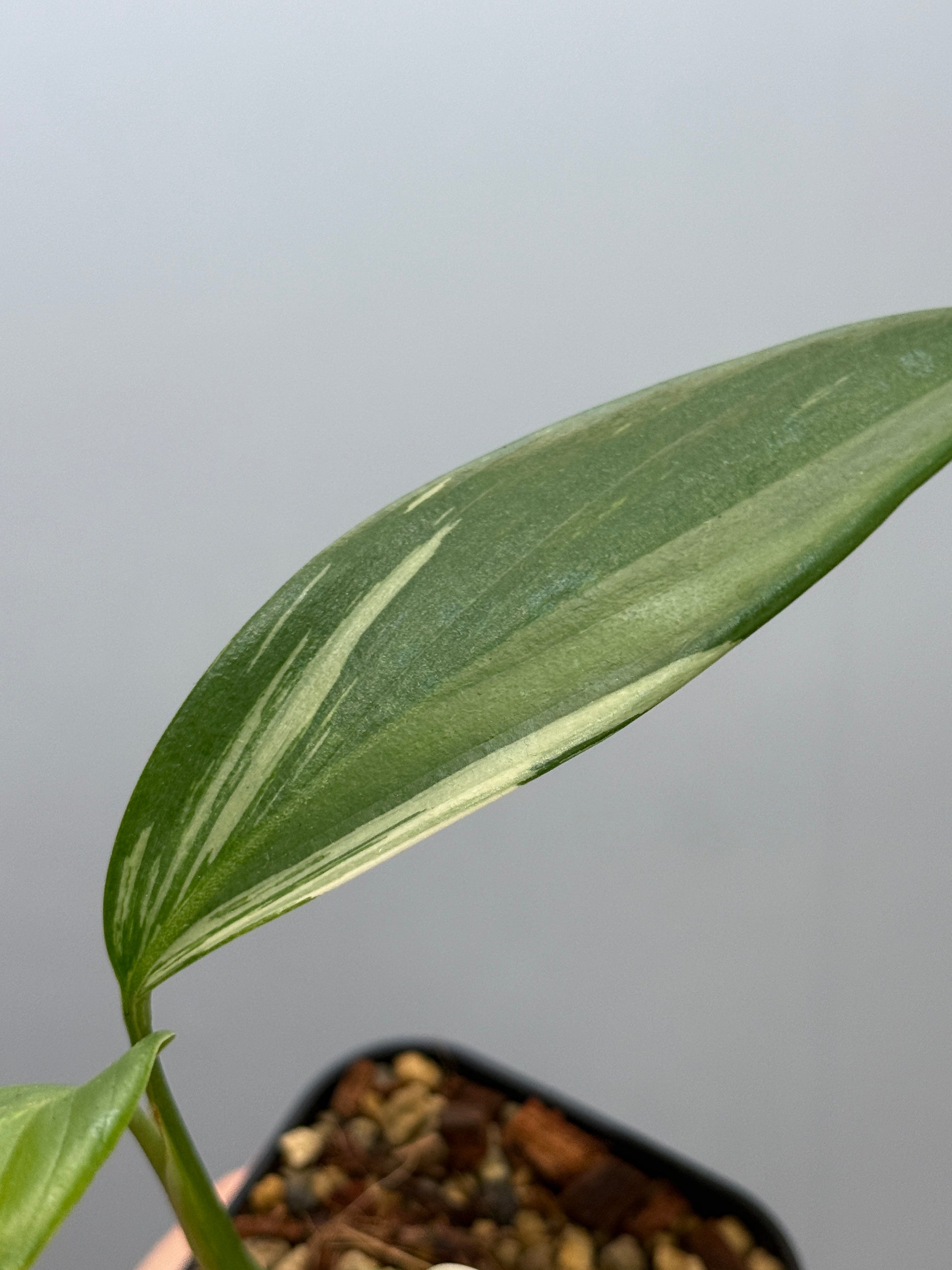 深い緑の葉にパキッとした白の斑が走り、シャープでスタイリッシュな印象を与える株です。