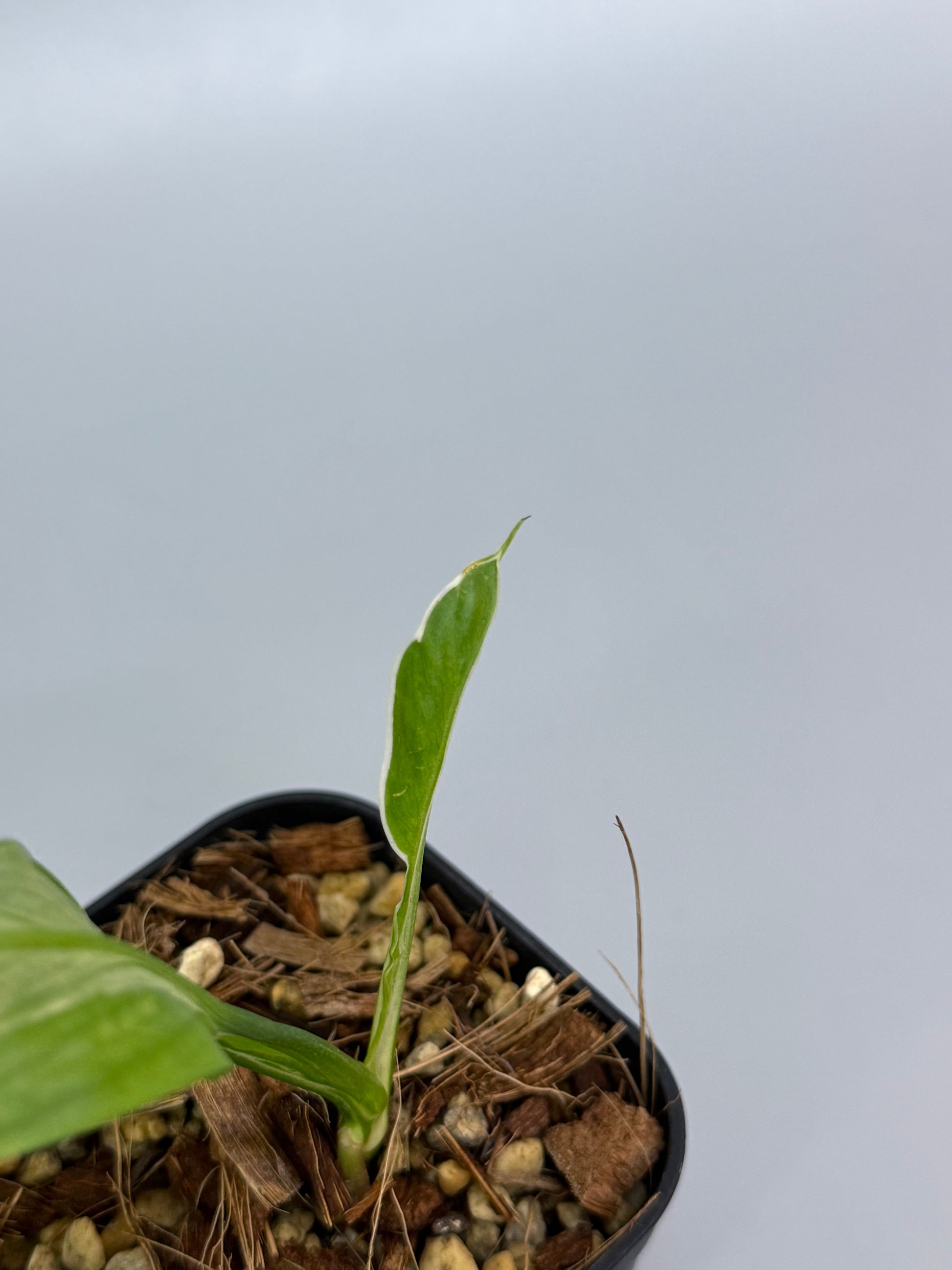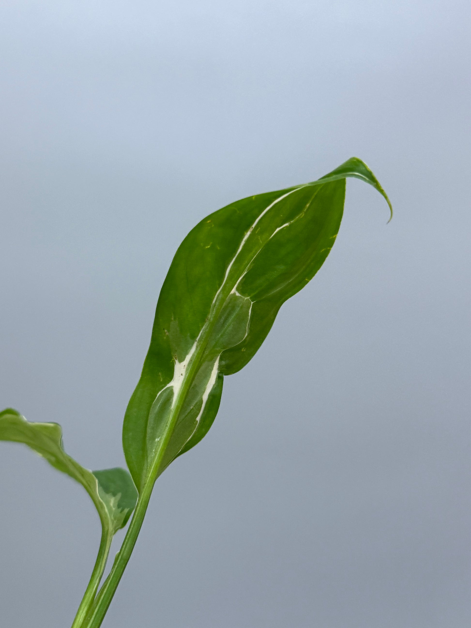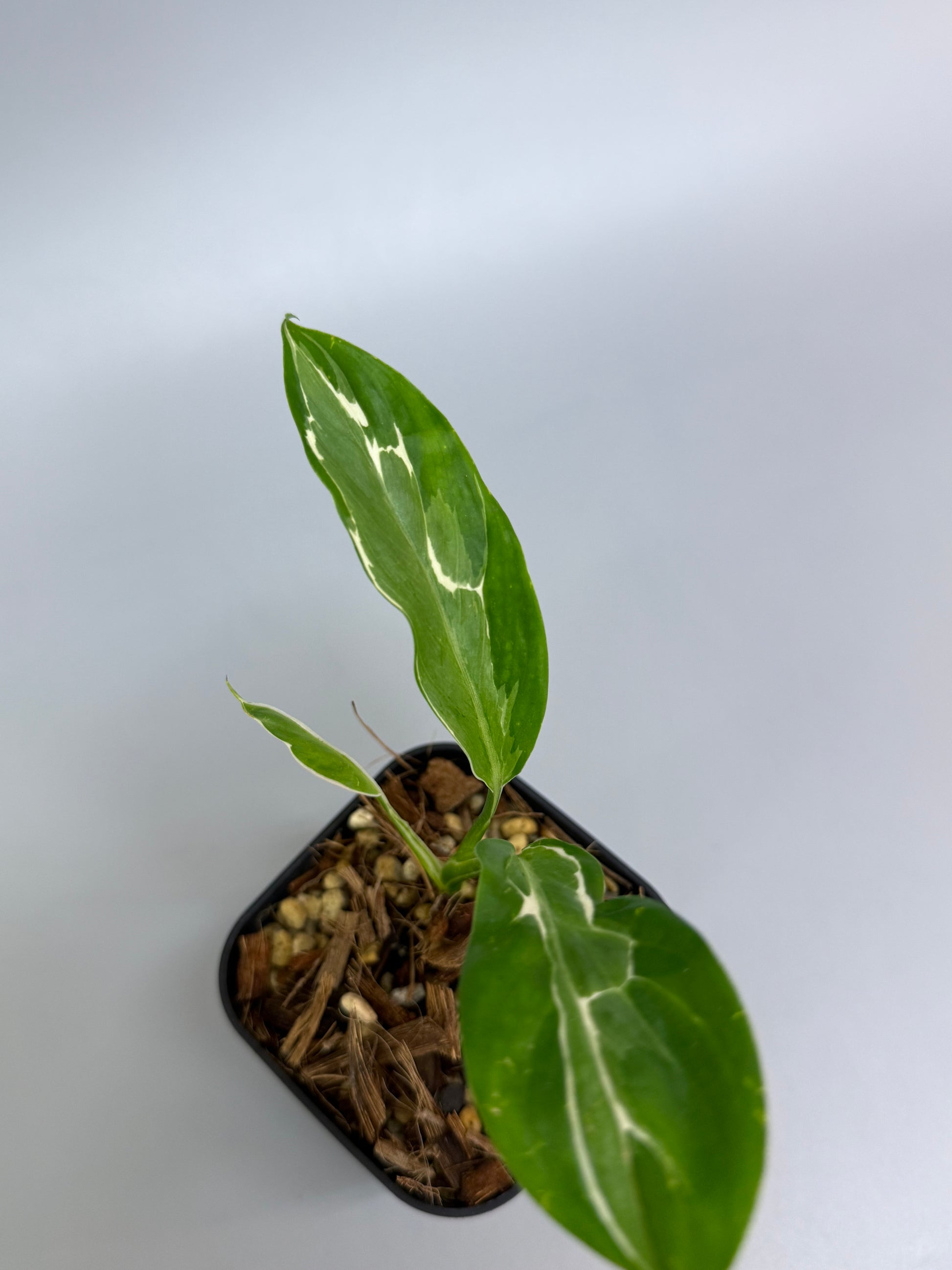薄く繊細な細葉シルエットに、葉の縁をなぞるように入る白斑が印象的な品種です。