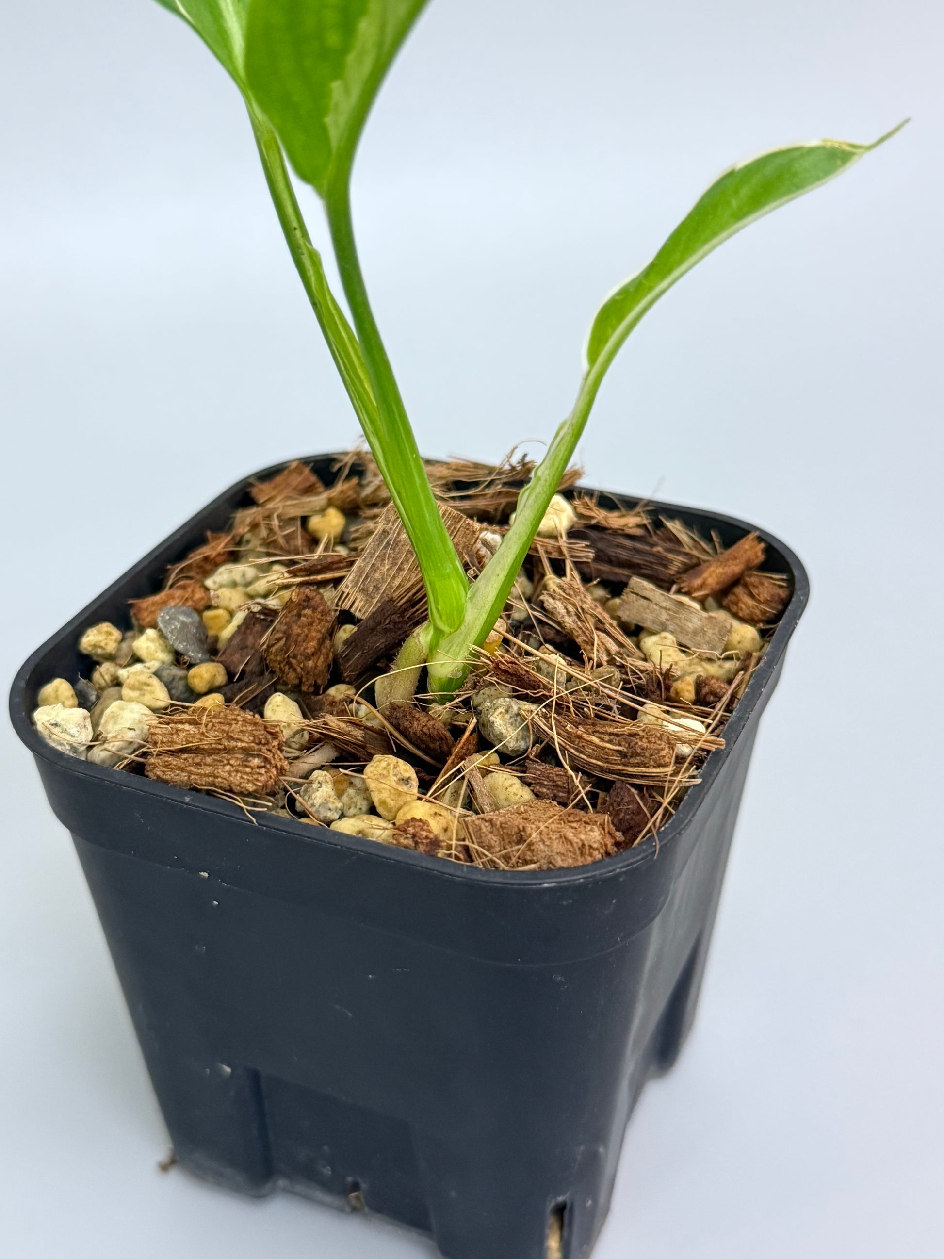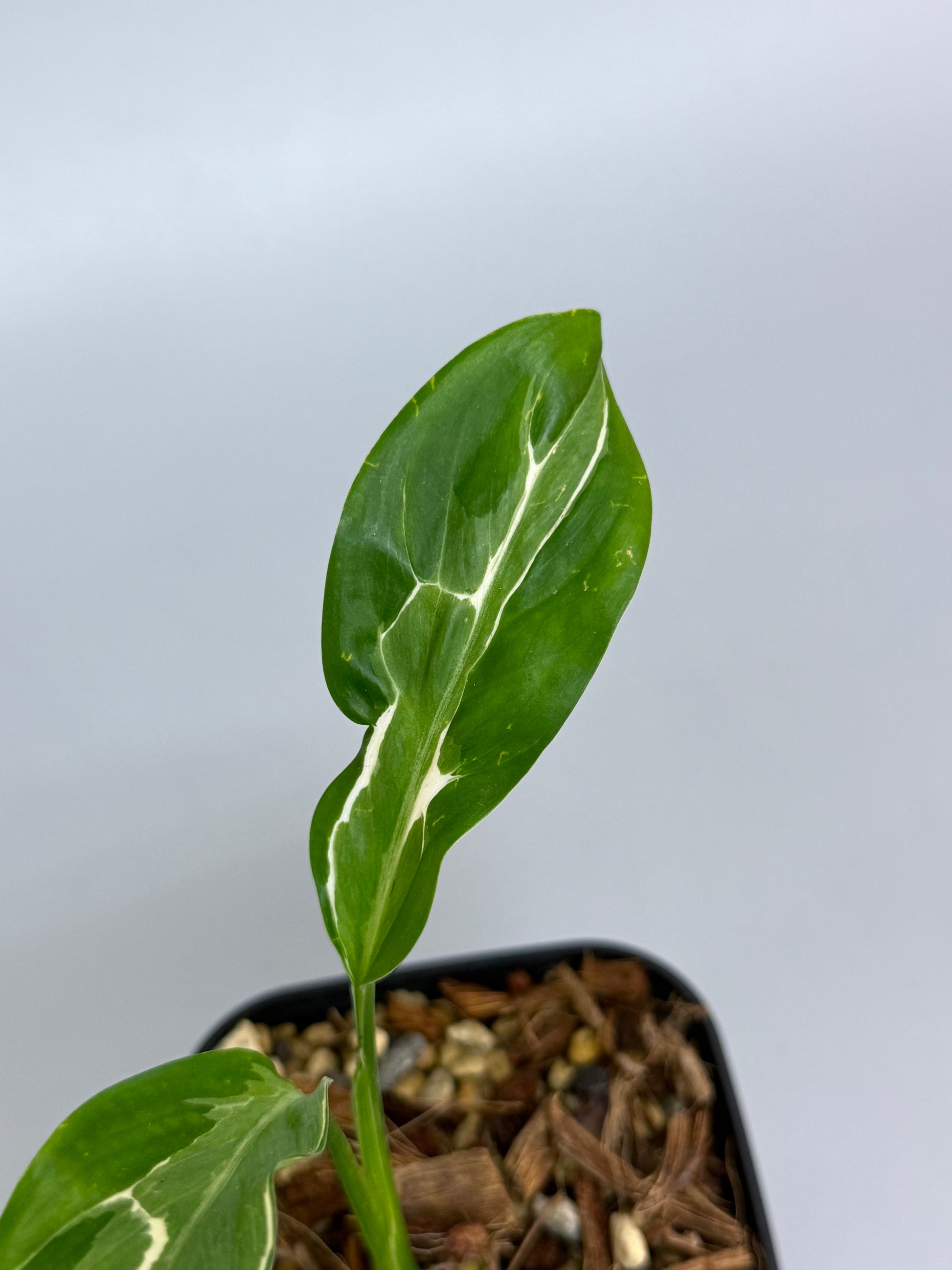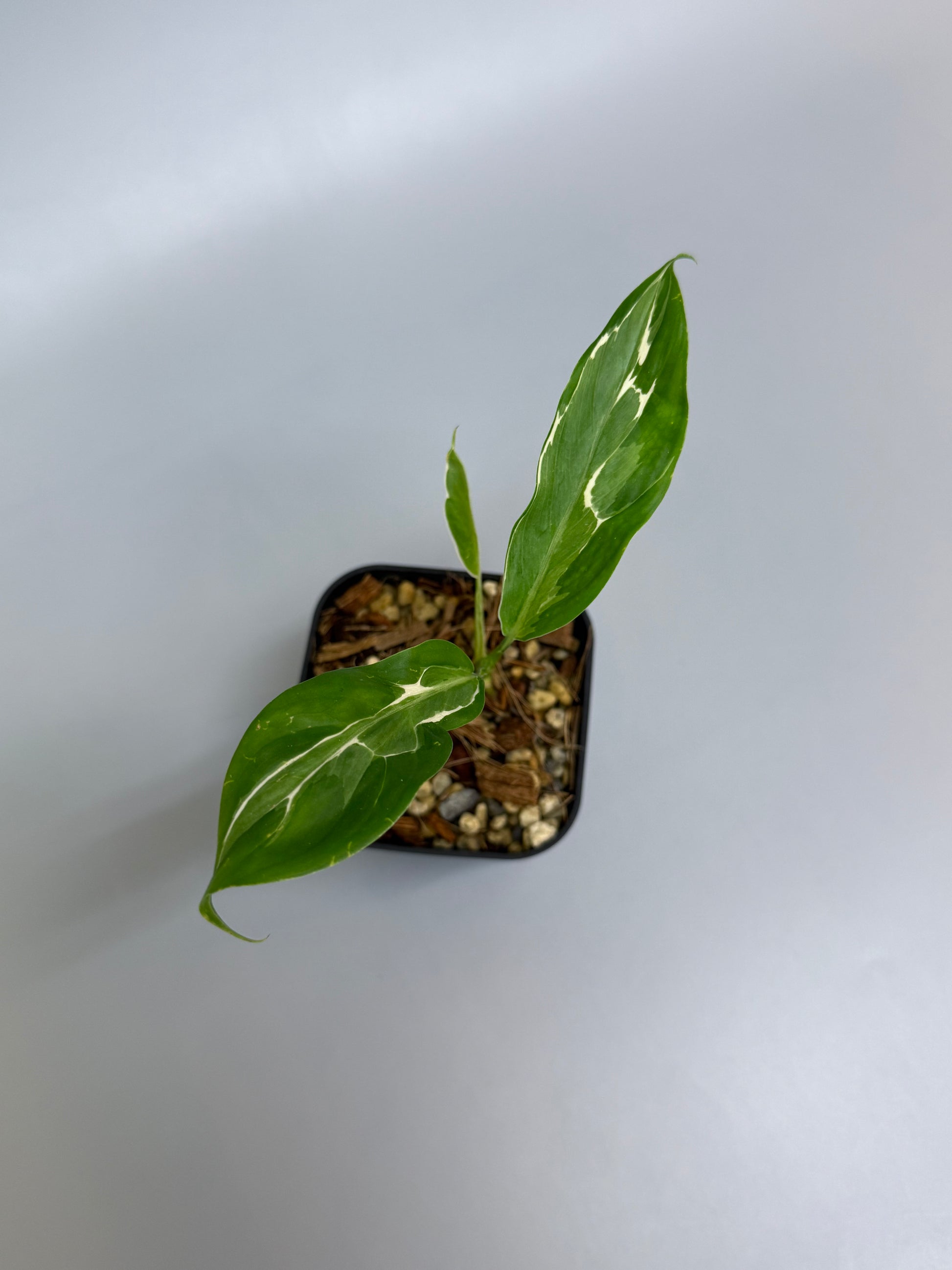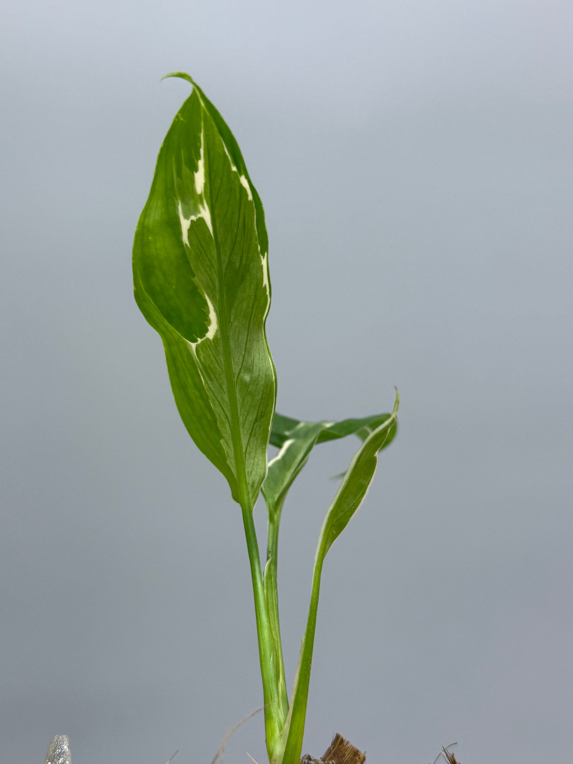 薄く繊細な細葉シルエットに、葉の縁をなぞるように入る白斑が印象的な品種です。
